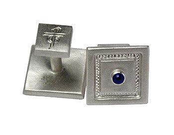 These custom designed silver cufflinks have a bezel-set round blue cabochon sapphire on the front and a hand-engraved logo on the reverse.